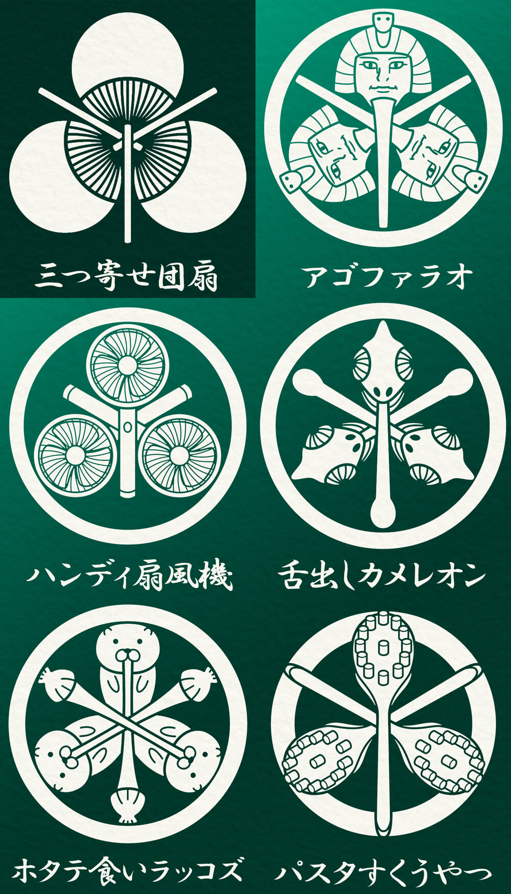 舌出しカメレオンは「三つ寄せ団扇」の家紋を参考に作りました。